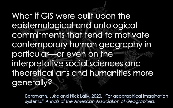 "What if GIS were built upon the epistemological and ontological commitments that tend to motivate contemporary human geography in particular—or even on the interpretative social sciences and theoretical arts and humanities more generally?"