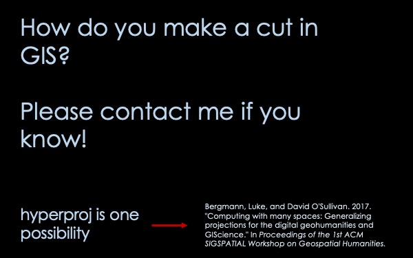 Please contact me if you know how to make a cut/tear in GIS! I don't know how to make this translation into GIS. One possibility is hyperproj—a method for calculating projections suggested by Bergmann and O'Sullivan